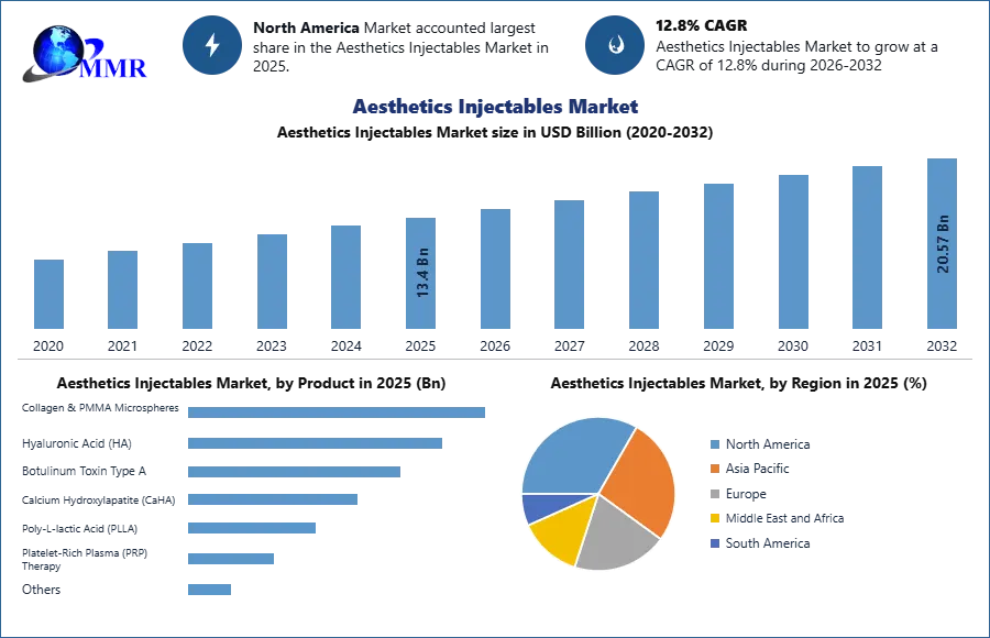 The Aesthetics Injectables Market size was valued at USD 13.4 Billion in 2025 and the total Aesthetics Injectables revenue is expected to grow at a CAGR of 12.8% from 2026 to 2032, reaching nearly USD 20.57 Billion.