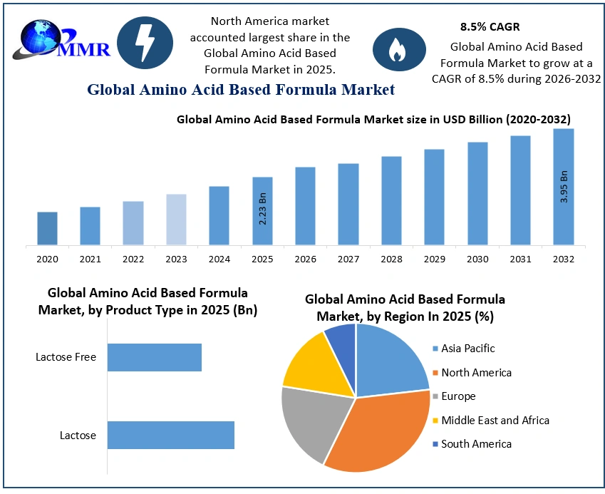 Amino Acid Based Formula Market Report Coverage Details Base Year: 2025 Forecast Period: 2026-2032 Historical Data: 2020 to 2025 Market Size in 2025: USD 2.23 Bn. Forecast Period 2026 to 2032 CAGR: 8.5% Market Size in 2032: USD 3.95 Bn. Segments Covered: by Product Type Lactose Lactose Free by Application New Born Infant Toddler Amino Acid Based Formula Market, by Region