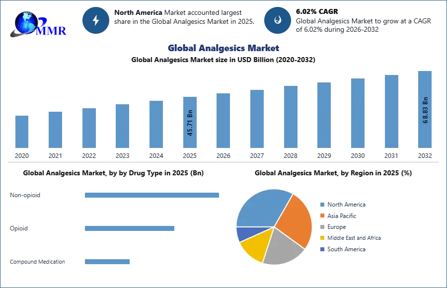 Analgesics Market size was valued at US$ 45.71 Bn in 2025 and the total revenue is expected to grow at 6.02 % through 2025 to 2032, reaching nearly US$ 68.83 Bn.
