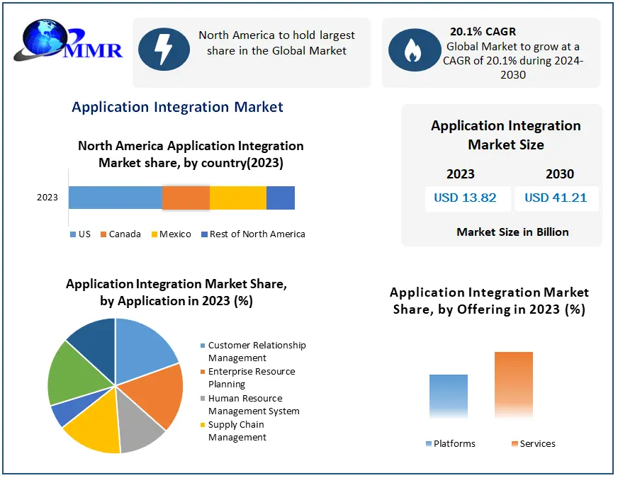 Global Application Integration Market Report Coverage Details Base Year: 2023 Forecast Period: 2024-2030 Historical Data: 2018 to 2023 Market Size in 2023: US $ 13.82 Bn. Forecast Period 2024 to 2030 CAGR: 20.1% Market Size in 2030: US $ 41.21 Bn. Segments Covered: by Integration Type Point-To-Point Integration Enterprise Application Integration Enterprise Service Bus Integration Platform as a Service Hybrid Integration by Offering Platforms Services Professional Services Consulting Integration Support and Maintenance Managed Service by Application Customer Relationship Management Enterprise Resource Planning Human Resource Management System Supply Chain Management Business Intelligence Electronic Health Record Management Other Applications by End-User Banking, Financial Services, and Insurance Retail & eCommerce Manufacturing Healthcare & Life Sciences Energy & Utilities Automotive Transportation and Logistics Government & Public Sector Other Verticals Application Integration Market, by Region