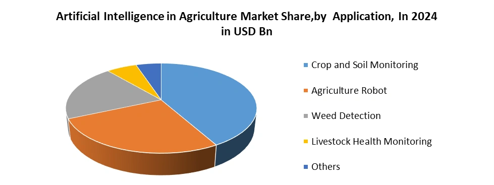 Based on the Technology, in 2024, Machine Learning dominates the Artificial Intelligence in Agriculture Market due to its widespread use in yield prediction, crop health monitoring, and precision farming decision-making. Computer Vision follows, driven by applications in crop disease detection, weed identification, and automated harvesting through drones and smart imaging systems. Predictive Analytics is gaining strong adoption for weather forecasting, demand planning, and resource optimization, supporting risk mitigation in farming operations. Natural Language Processing (NLP) plays a growing role in voice-enabled advisory platforms, farm management software, and multilingual farmer support systems, particularly in emerging economies. The Others segment, including robotics intelligence and expert systems, contributes to niche applications such as autonomous farm equipment and smart irrigation, supporting the gradual expansion of advanced AI capabilities across the agricultural value chain. Based on Application, in 2024, Crop and Soil Monitoring holds the largest share in the Artificial Intelligence in Agriculture Market, driven by strong adoption of AI-enabled sensors, drones, and analytics for real-time field assessment and yield optimization. Agriculture Robots are witnessing rapid growth due to increasing labor shortages and rising demand for automated planting, harvesting, and spraying solutions. Weed Detection is gaining traction as AI-powered image recognition improves precision spraying and reduces herbicide usage, supporting sustainable farming practices. Livestock Health Monitoring is expanding steadily, supported by AI-based tracking, disease prediction, and productivity management in dairy and poultry farming. The Others segment includes applications such as smart irrigation, farm management platforms, and supply chain optimization, contributing to broader AI integration across agricultural operations.![]()