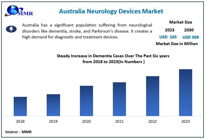 Australia Neurology Devices Market Report Coverage Details Base Year: 2023 Forecast Period: 2024-2030 Historical Data: 2018 to 2023 Market Size in 2023: US $ 165 Mn. Forecast Period 2024 to 2030 CAGR: 9.4% Market Size in 2030: US $ 309 Mn. Segments Covered: by Product Type Deep Brain Stimulation Devices Sacral Nerve Stimulation Vagus Nerve Stimulation Interventional Neurology CSF Management Neurosurgery Devices Neurostimulation Spinal Cord Stimulation Devices Gastric Electric Stimulation by End User Specialty Centres Hospitals and Clinics Key Players in the Australia Neurology Devices Market