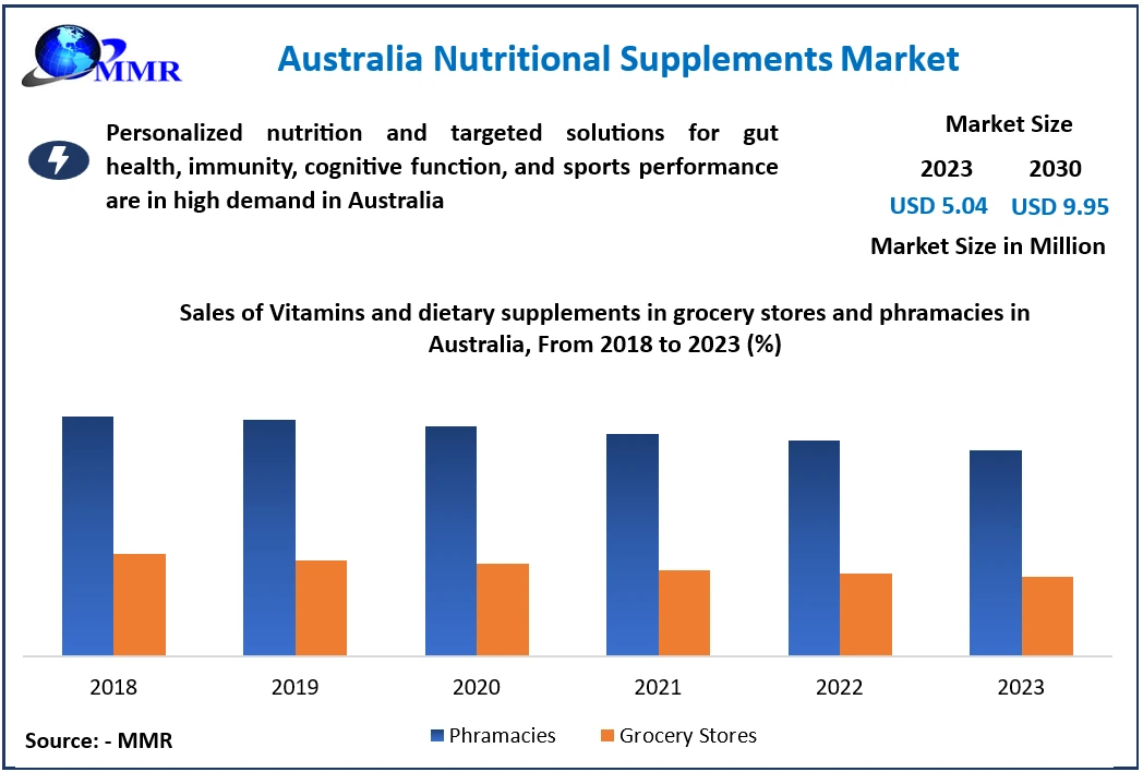Nutritional Supplements are designed to offer nutrients that are absent and insufficient in a person’s usual diet are called nutritional supplements. The market for nutritional supplements is growing because of factors. The market for nutritional supplements is growing because of factors. Demand rises as people prioritize preventative health and well-being because of growing health awareness. The growing older population generates a significant market segment thanks to their particular health needs. Personalized nutrition is becoming more popular among consumers, who look for supplements based on research and customized to address specific health issues. There is untapped potential in the nutritional supplement market for specialist and specific goods that target particular health issues including gut health, athletic performance, and cognitive function. The development of platforms for personalized supplementation that use technology to create unique nutritional mixes and dosages has promise for treating specific health requirements. Transparency in sustainability measures, such as using locally sourced food and eco-friendly packaging, attracts environmentally conscious consumers and builds brand loyalty.To know about the Research Methodology :- Request Free Sample Report 1. By 2023, sales of organic and natural supplements are projected to reach $xx million, growing at a compound annual growth rate of xx%. 2. Grocery stores and pharmacies remain the dominant channels, accounting for xx% and xx% of the market share respectively, though online sales are gaining traction Increased Demand for Natural and Organic Products There is an evident shift in the Australian nutritional supplement sector toward natural and organic products. A greater number of customers are prioritizing local sourcing, minimum chemicals, and pure ingredients in their supplements thanks to their growing health consciousness. Established firms in the nutritional supplement market are diversifying their product ranges to include natural and organic offerings in response to changing consumer preferences. To stay competitive, they are taking this calculated risk by diversifying their holdings. At the same time, an abundance of new businesses is making their debut with a concentration on natural and organic supplements, offering unique and specialized goods to fill particular needs in the market. Significantly, there is a greater need for certification producers of supplements are progressively pursue organic certifications from organizations like NASAA and ACO. It is a reflection of a larger industry trend toward quality control and transparency in response to changing customer demands. According to the MMR Survey, up to xx% of Australian consumers actively look for supplements that are natural and organic. The significant figure indicates a definite desire for these goods.