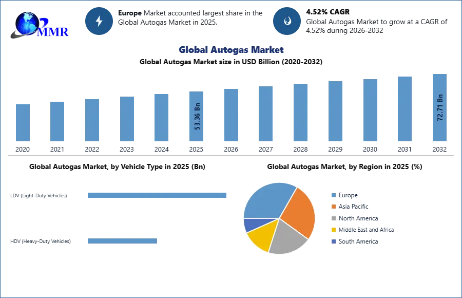 Autogas Market size was valued at USD 53.36 Bn. in 2025 and the Autogas is expected to grow by 4.52 % from 2026 to 2032, reaching nearly USD 72.71 Bn by 2032.