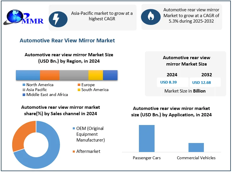 Global Automotive Rear View Mirror Market Report Coverage Details Base Year: 2024 Forecast Period: 2025-2032 Historical Data: 2019 to 2024 Market Size in 2024: USD 8.39 Bn. Forecast Period 2025 to 2032 CAGR: 5.3% Market Size in 2032: USD 12.68 Bn. Segments Covered: by Type Exterior Mirror Interior Mirror by Sales Channel OEM Aftermarket by Application Passenger Cars Commercial Vehicles Automotive Rear View Market by Region