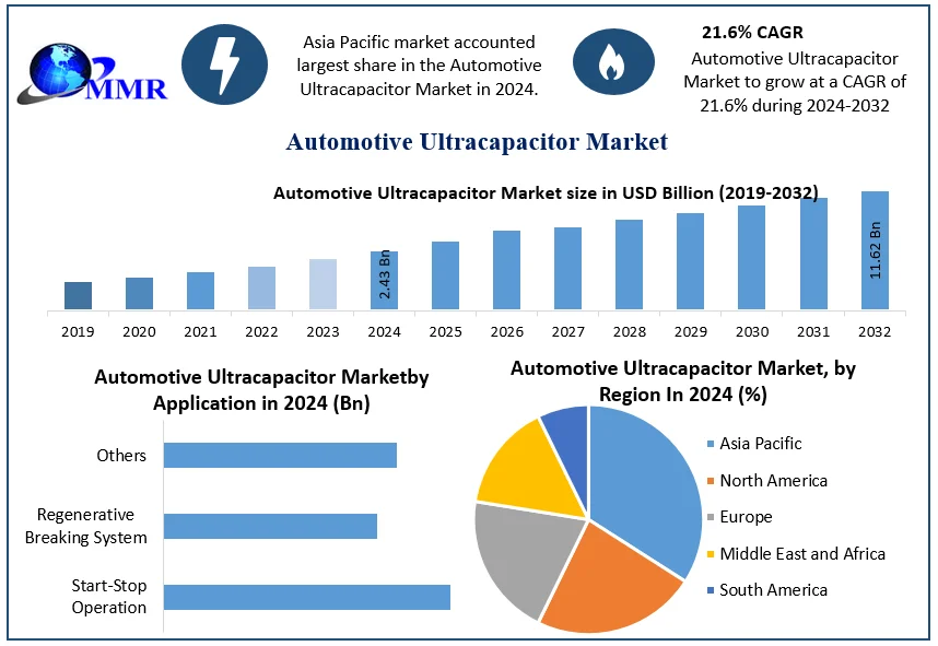 Automotive Ultracapacitor Market was valued at USD 2.43 Bn. in 2024 & is expected to reach USD 11.62 bn by 2032. The Automotive Ultracapacitor Market size is expected to grow at a CAGR of 21.6 % through the forecast period.Automotive Ultracapacitor Market Overview: