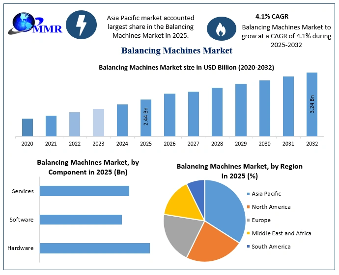 The Balancing Machines Market size was valued at USD 2.44 Billion in 2025 and the total Balancing Machines revenue is expected to grow at a CAGR of 4.1% from 2026 to 2032, reaching nearly USD 3.24 Billion by 2032. The MMR report provides a detailed analysis of the Balancing Machines Market, encompassing regional pricing structures, demand dynamics, customer procurement behavior, and end-use industry trends. It highlights technological advancements such as automation, CNC integration, AI, IoT, and digital twin applications, along with innovations in energy efficiency and sustainability. The report further examines import–export trends, supply chain networks, and distribution frameworks, offering insights into trade policies, regulatory standards (ISO, CE, ANSI, JIS, BIS), and green manufacturing practices. it emphasizes cost structure optimization, market drivers, procurement strategies, and the growing focus on eco-friendly production and circular economy initiatives.Balancing Machines Market Overview
