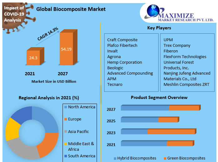 The wide application spectrum of wood fiber composites in manufacturing and window frames is anticipated to drive considerable growth in demand in the United States during the forecast period. Additionally, the rising demand for bio-based polymers in landscapes and street development is expected to drive the product demand. Because of rising per capita income and increasing industrialization, Asia Pacific is anticipated to be the fastest-growing market for wood fiber composites. Over the forecast period, the change in consumer behavior in China, expanding competition from local manufacturers, decentralized distribution, and rising dual-income families are likely to generate possibilities for biocomposites manufacturers. Housing construction in Central and South American regions has increased significantly as a result of growing wage levels and a movement in customer preference toward green structures. The development of the industrial construction sector, together with legislative measures to raise public awareness about sustainable construction, is likely to drive the growth of the regional biocomposites market. Soaring concerns about the global economy as a result of the continued decline in the Europe and China relations, US-China trade negotiations, the political landscape between China and Hong Kong, and Brexit outcomes are expected to have an impact on international investments, trade, and ongoing residential projects, and markets around the world. This, in turn, is expected to restrict the market growth during the forecast period. The objective of the report is to present a comprehensive analysis of the Biocomposite market to the stakeholders in the industry. The past and current status of the industry with the forecasted market size and trends are presented in the report with the analysis of complicated data in simple language. The report covers all the aspects of the industry with a dedicated study of key players that include market leaders, followers, and new entrants. PORTER, PESTEL analysis with the potential impact of micro-economic factors of the market have been presented in the report. External as well as internal factors that are supposed to affect the business positively or negatively have been analyzed, which will give a clear futuristic view of the industry to the decision-makers. The report also helps in understanding the Biocomposite market dynamics, and structure by analyzing the market segments and projecting the Biocomposite market size. Clear representation of competitive analysis of key players by product, price, financial position, product portfolio, growth strategies, and regional presence in the Biocomposite market make the report investor’s guide.Biocomposite Market Scope: Inquiry Before Buying