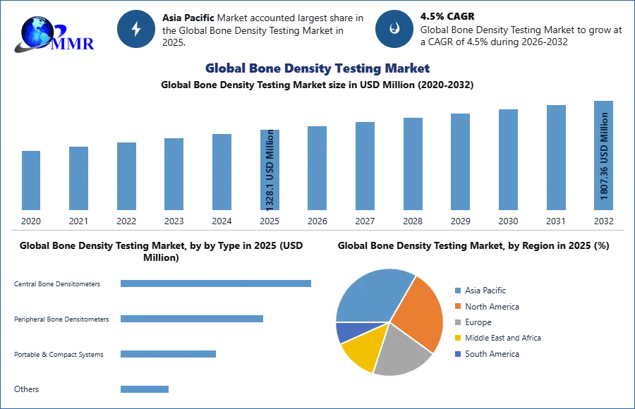 Bone Density Testing Market size was valued at US$ 1328.1 Mn in 2025 and the total revenue is expected to grow at 4.5 % through 2025 to 2032, reaching nearly US$ 1807.36 Mn.