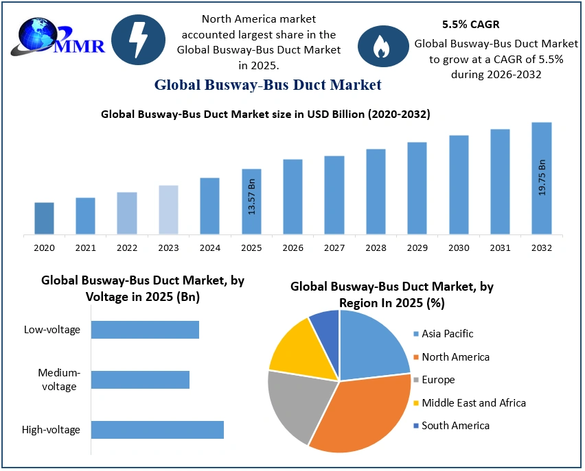 Global Busway-Bus Duct Market Report Coverage Details Base Year: 2025 Forecast Period: 2026-2032 Historical Data: 2020 to 2025 Market Size in 2025: USD 13.57 Bn. Forecast Period 2026 to 2032 CAGR: 5.5% Market Size in 2032: USD 19.75 Bn. Segments Covered: by Type Isolated Phase Bus Duct Segregated Phase Bus Duct Non-segregated Phase Bus Duct by Voltage High-voltage Medium-voltage Low-voltage by End User Industry Residential Commercial Data Centers Office Buildings Others Industrial Busway-Bus Duct Market, by Region