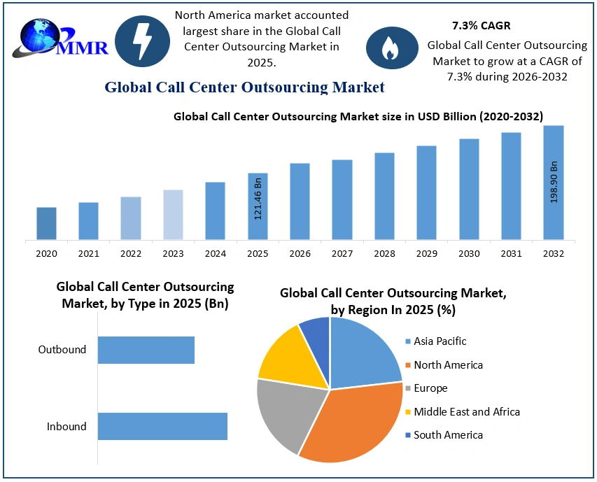 Call Center Outsourcing Market Report Coverage Details Base Year: 2025 Forecast Period: 2026-2032 Historical Data: 2020 to 2025 Market Size in 2025: USD 121.46 Bn. Forecast Period 2026 to 2032 CAGR: 7.3% Market Size in 2032: USD 198.90 Bn. Segments Covered: by Type Inbound Outbound by Service Type Voice support Email support Chat support Social media support Video support by Enterprise Size Large enterprises SMEs by Vertical BFSI IT and telecom Healthcare Retail Manufacturing Others Call Center Outsourcing Market, by Region