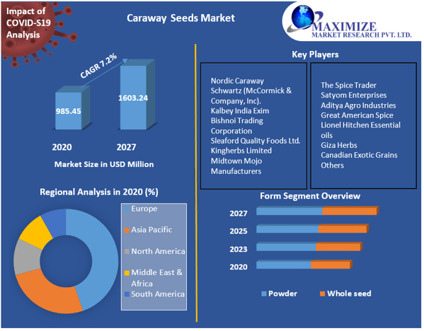 Thanks to increased demand for caraway seed in the pharmaceutical and food industries, the European caraway seed market is expected to provide a considerable proportion of revenue to the global market. Also, rising awareness of caraway seeds among the health-conscious population is likely to contribute to the global market's revenue growth. Due to the rising demand for condiments and spices in various culinary products, the Asia Pacific market is expected to rise significantly. Rapid urbanization, high disposable income, and the existence of significant caraway seed producers are expected to fuel the global market's revenue growth in the Asia Pacific. The objective of the report is to present a comprehensive analysis of the global Caraway Seeds to the stakeholders in the industry. The past and current status of the industry with the forecasted market size and trends are presented in the report with the analysis of complicated data in simple language. The report covers all the aspects of the industry with a dedicated study of key players that include market leaders, followers, and new entrants. PORTER, PESTEL analysis with the potential impact of micro-economic factors of the market has been presented in the report. External as well as internal factors that are supposed to affect the business positively or negatively have been analyzed, which will give a clear futuristic view of the industry to the decision-makers. The report also helps in understanding the Caraway Seeds dynamics, structure by analyzing the market segments and project the Caraway Seeds size. Clear representation of competitive analysis of key players by product, price, financial position, product portfolio, growth strategies, and regional presence in the global Caraway Seeds make the report investor’s guide.Caraway Seeds Market Scope: Inquire before buying