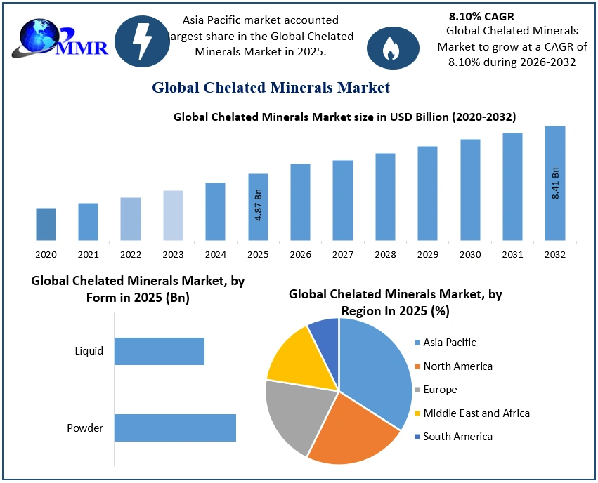 Chelated Minerals Market Report Coverage Details Base Year: 2025 Forecast Period: 2026-2032 Historical Data: 2020 to 2025 Market Size in 2025: USD 4.87 Bn. Forecast Period 2026 to 2032 CAGR: 8.10% Market Size in 2032: USD 8.41 Bn. Segments Covered: by Type Iron Zinc Copper Calcium by Form Powder Liquid by Agent Amino Acids Organic Acid Proteinates Others Chelated Minerals Market, by Region