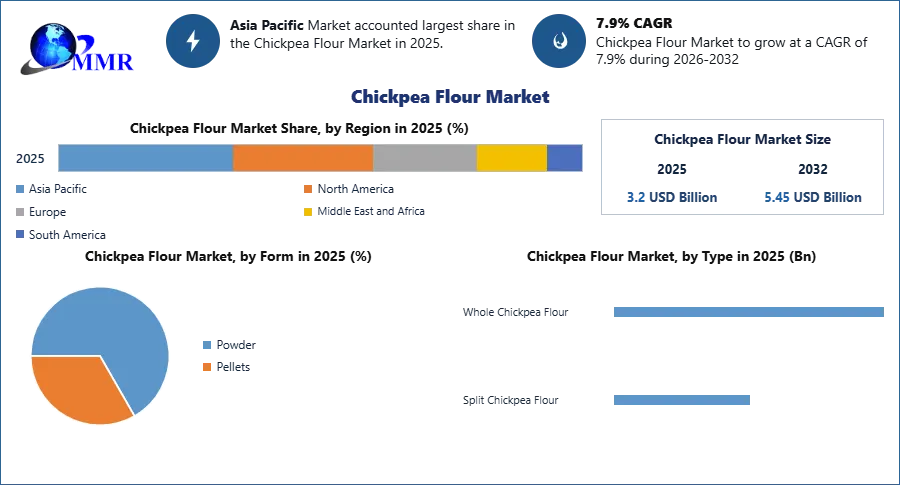 Chickpea Flour Market size was valued at USD 3.2 Bn. in 2025 and the total Chickpea Flour Market revenue is expected to grow at 7.9% from 2026 to 2032, reaching nearly USD 5.45 Bn.