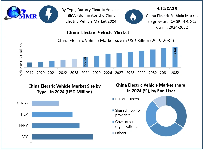 China Electric Vehicle Market Report Coverage Details Base Year: 2024 Forecast Period: 2025-2032 Historical Data: 2019 to 2024 Market Size in 2024: USD 272.58 Mn. Forecast Period 2025 to 2032 CAGR: 4.5% Market Size in 2032: USD 387.64 Mn. Segments Covered: by Type BEV PHEV HEV Others by Vehicle Type Two-wheelers Passenger Cars Commercial Vehicles by End User Shared mobility providers Government organizations Personal users Others China Electric Vehicle Market, Key Players: