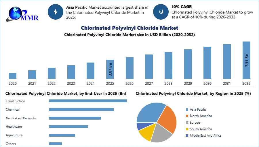 The Chlorinated Polyvinyl Chloride Market size was valued at USD 3.87 Billion in 2025 and the total Chlorinated Polyvinyl Chloride revenue is expected to grow at a CAGR of 10% from 2025 to 2032, reaching nearly USD 7.54 Billion.