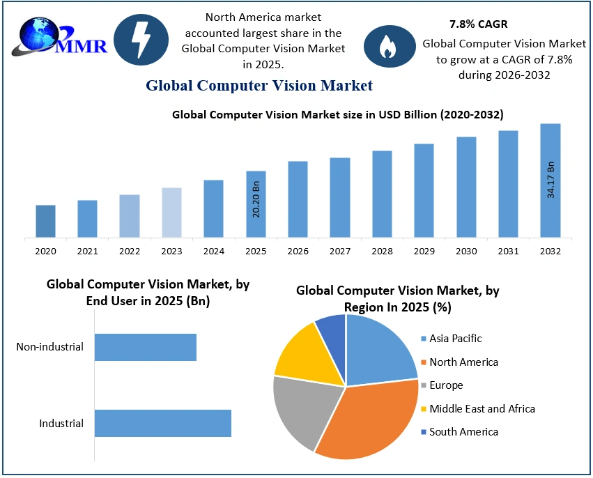 Computer Vision Market Report Coverage Details Base Year: 2025 Forecast Period: 2026-2032 Historical Data: 2020 to 2025 Market Size in 2025: USD 20.20 Bn. Forecast Period 2026 to 2032 CAGR: 7.8% Market Size in 2032: USD 34.17 Bn. Segments Covered: by Component Hardware Software Service by Product PC-based Computer Vision Systems Smart Cameras-based Computer Vision Systems by Application Quality Assurance and Inspection Positioning and Guidance Measurement Identification Predictive Maintenance by End-User Industrial Non-industrial Computer Vision Market, by Region