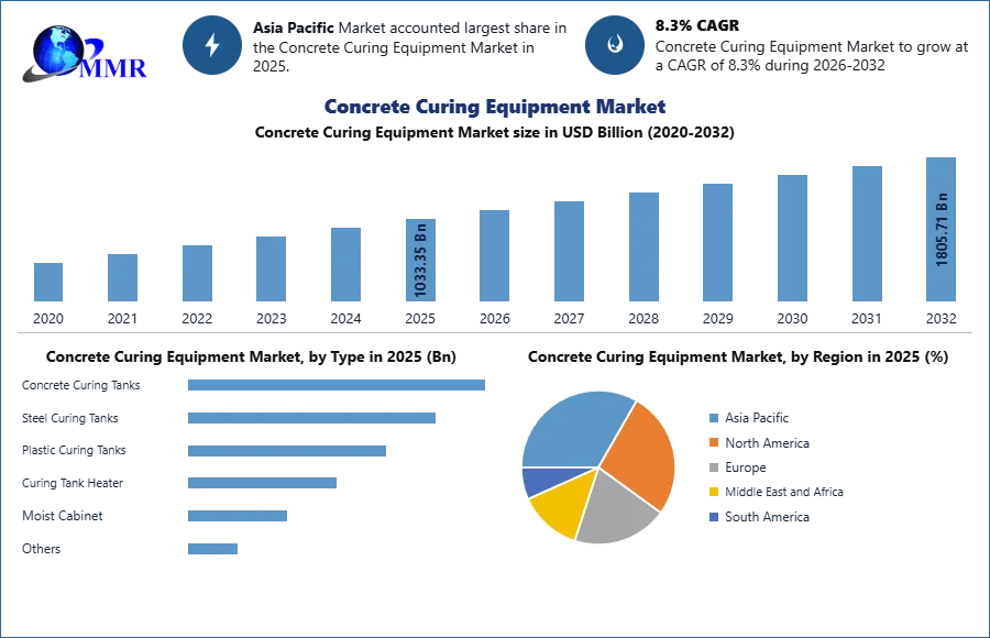 Concrete Curing Equipment Market size was valued at US$ 1033.35 Bn. in 2025 and the total revenue is expected to grow at a CAGR of 8.3% through 2026 to 2032, reaching nearly US$ 1805.71 Bn.