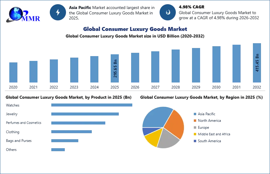 The Consumer Luxury Goods Market size was valued at USD 295.65 billion in 2025 and the total Consumer Luxury Goods Market revenue is expected to grow at a CAGR of 4.98% from 2025 to 2032, reaching nearly USD 415.45Billion.