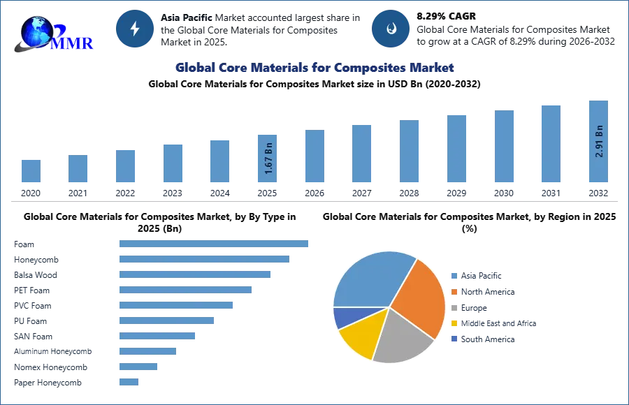 Global Core Materials for Composites Market was valued at USD 1.67 Bn in 2025 and is expected to reach USD 2.91 Bn by 2032, growing at a CAGR of 8.29% during the forecast period.