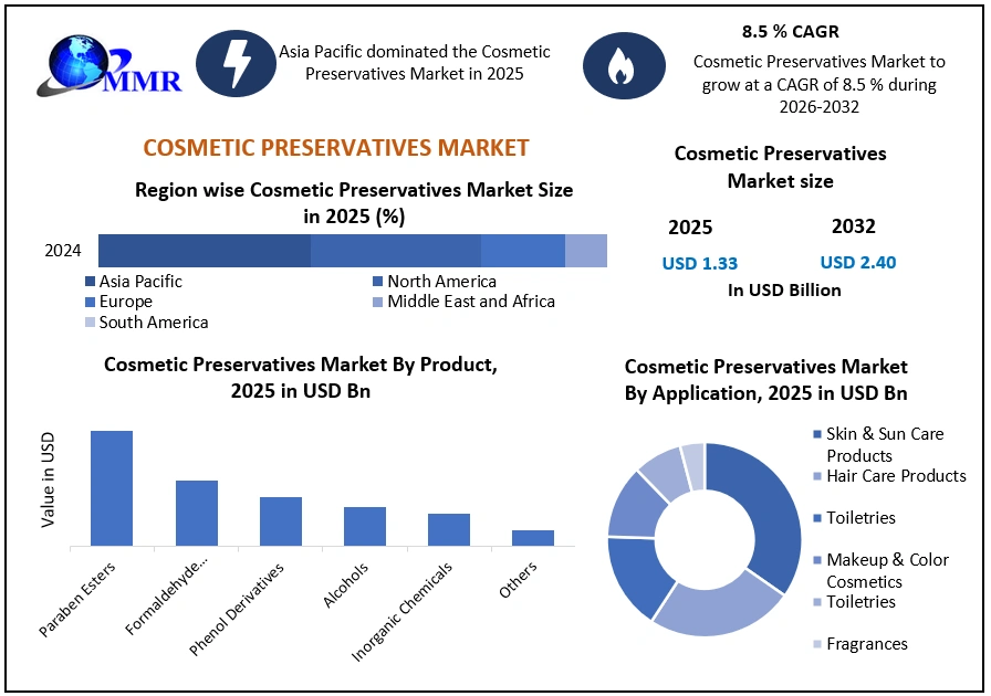 Cosmetic Preservatives Market Report Coverage Details Base Year: 2025 Forecast Period: 2026-2032 Historical Data: 2020 to 2025 Market Size in 2025: USD 1.33 Bn Forecast Period 2026 to 2032 CAGR: 8.5% Market Size in 2032: USD 2.40 Bn. Segments Covered: by Products Paraben Esters Formaldehyde Releasers Phenol Derivatives Alcohols Inorganic Chemicals Others by Application Skin & sun care Products Toiletries Hair care Products Fragrances & Perfumes Makeup & Color Others Cosmetic Preservatives by Region