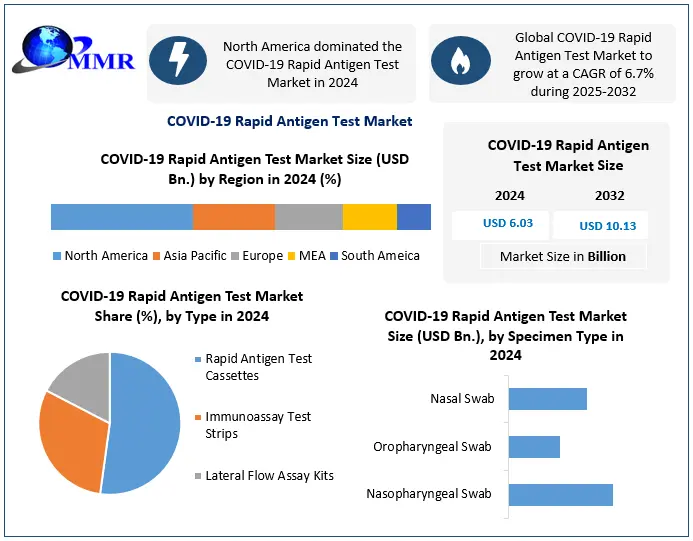 COVID-19 Rapid Antigen Test Market was valued at USD 6.03 Bn. in 2024, and total global COVID-19 Rapid Antigen Test Market revenue is expected to grow at a CAGR of 6.7% from 2025 to 2032, reaching nearly USD 10.13 Bn. Growing demand for fast and affordable testing.COVID-19 Rapid Antigen Test Market Overview: