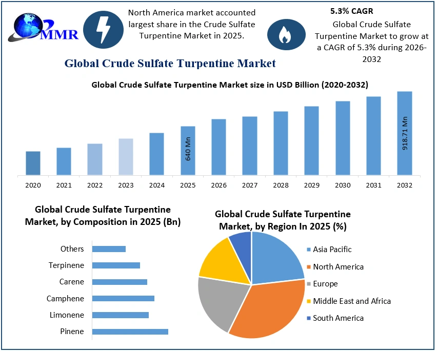 Global Crude Sulfate Turpentine Market Report Coverage Details Base Year: 2025 Forecast Period: 2026-2032 Historical Data: 2020 to 2025 Market Size in 2025: USD 640 Mn Forecast Period 2026 to 2032 CAGR: 5.3% Market Size in 2032: USD 918.71 Mn Segments Covered: by Composition Pinene Limonene Camphene Carene Terpinene Others by Application Solvents Aromatic Chemicals Flavoring Agent Adhesives Paint Thinners Printing Ink Others Crude Sulfate Turpentine Market, by Region