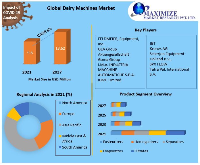 Dairy Machines Market report examines the market's growth drivers as well as its segments. Report includes market participants, and regional insights. This market study takes an in-depth look at all of the significant advancements that are currently occurring across all industry sectors. To provide key data analysis for the historical period (2017-2022), statistics, infographics, & presentations are used. The report examines the Dairy Machines markets, Drivers, Restraints, Opportunities, & Challenges. This Maximize report includes investor recommendations based on a detailed analysis of the current competitive landscape of the Dairy Machines market. After the milk has been processed, dairy machines are utilised to provide various dairy products. Cheese, sugar, milk, tofu, and a variety of other components are included. These machines can also keep milk fresh for several days and monitor the impact of foodborne infections. Equipment includes automatic milking machines, pasteurizers and parlour appliances, milk pots, and other goods. Milk, fresh dairy products, milk powder, cheese, and other goods are all made with it in the food and beverage industry. Separators, pasteurizers, membrane filtering equipment, homogenizers, mixers and blenders, evaporators and dryers, and other dairy machines are among them. Some of the applications include protein ingredients, processed milk, milk powder, fresh dairy products, cheese, and butter and buttermilk. The market is being driven by increased consumption and production of milk and dairy products such as yoghurt, cheese, milk powder, and others, as well as rising need for improved equipment. For the years 2023-2029, rising automation usage in dairy machines is expected to boost the overall market development of the Dairy Machines Market.To know about the Research Methodology :- Request Free Sample Report