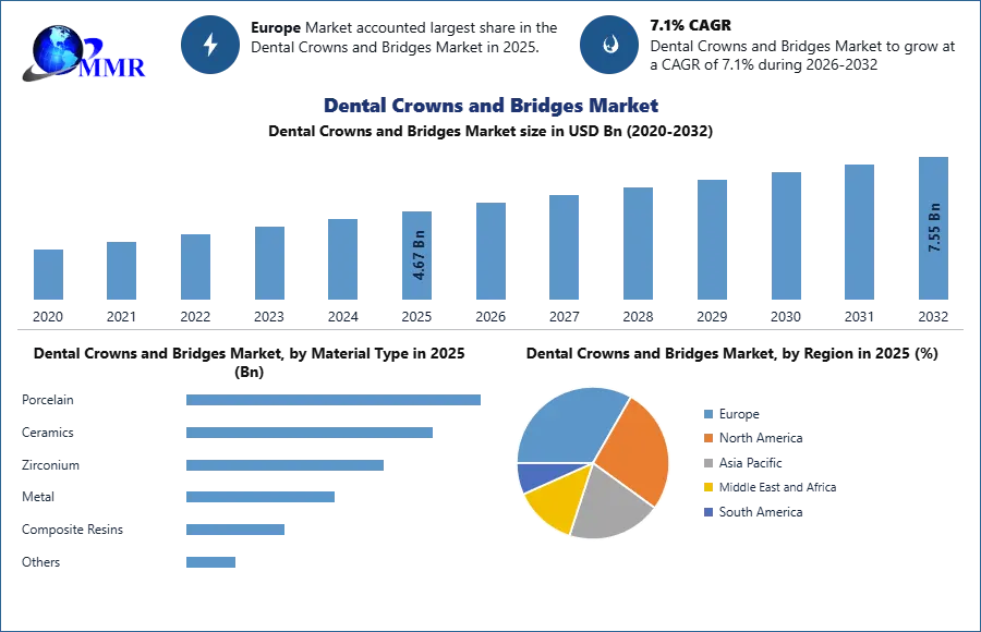 Global Dental Crowns and Bridges Market size was valued at USD 4.67 Bn in 2025, and the total Dental Crowns and Bridges Market revenue is expected to grow at a CAGR of 7.1% from 2025 to 2032, reaching nearly USD 7.55 Bn.