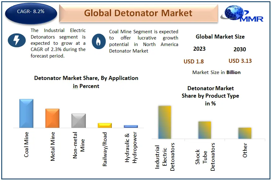 Detonator Market Report Coverage Details Base Year: 2023 Forecast Period: 2024-2030 Historical Data: 2018 to 2023 Market Size in 2023: US $ 1.8 Bn. Forecast Period 2024 to 2030 CAGR: 8.2% Market Size in 2030: US $ 3.13 Bn. Segments Covered: by Product Type Industrial Electric Detonators Shock Tube Detonators Other by Application Coal Mine Metal Mine Non-metal Mine Railway/Road Hydraulic & Hydropower Detonator Market, by Region