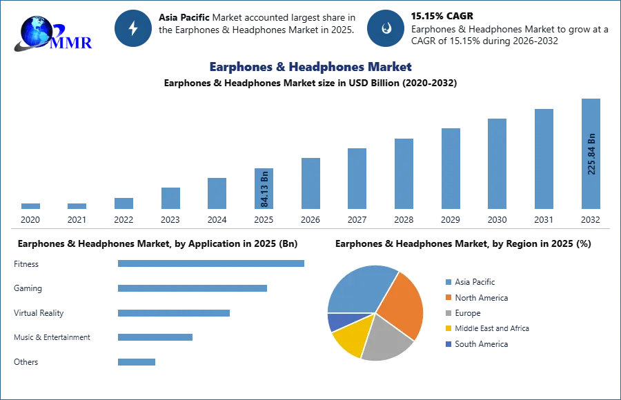Earphones & Headphones Market is anticipated to reach USD 225.84 Billion. by 2032 from USD 84.13 Billion. in 2025 at a CAGR of 15.15% during the forecast period.