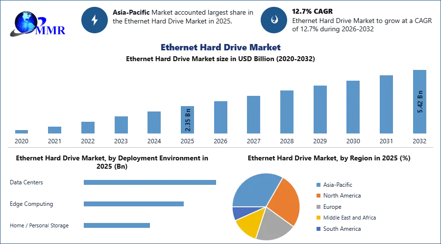 Ethernet Hard Drive Market size was valued at USD 2.35 Bn in 2025 and the total revenue is expected to grow at 12.7% through 2026 to 2032, reaching nearly USD 5.42 Bn.