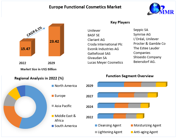 Europe Functional Cosmetics Market was worth US$ 15.47 Bn. in 2022 and total revenue is expected to grow at a rate of 6.1% CAGR from 2023 to 2029, reaching almost US$ 23.42 Bn. in 2029.