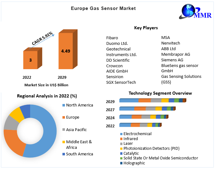 Global Scope of the Europe Gas Sensor Market Report Coverage Details Base Year: 2022 Forecast Period: 2023-2029 Historical Data: 2018 to 2022 Market Size in 2022: US $ 3 Bn. Forecast Period 2023 to 2029 CAGR: 5.91% Market Size in 2029: US $ 4.49 Bn. Segments Covered: By Technology Electrochemical Infrared Laser Photoionization Detectors (PID) Catalytic Solid State Or Metal Oxide Semiconductor Holographic Zirconia By Gas Type Chlorine (Cl) Nitrogen Oxides Ammonia Oxygen Carbon Dioxide (CO2) Carbon Monoxide (CO) Hydrogen Sulfide (H2S) Hydrocarbons (Propane, Butane, Etc.) Hydrogen Methane By End-use Application Medical Food & Beverages Oil & Gas Water & Wastewater Treatment Automotive and Transportation Mining Metals & Chemicals Smart Cities Consumer Electronics Power Stations By Geography Europe UK Germany Italy France Russia Spain Others Some of the key players of the Europe Gas Sensor market include: