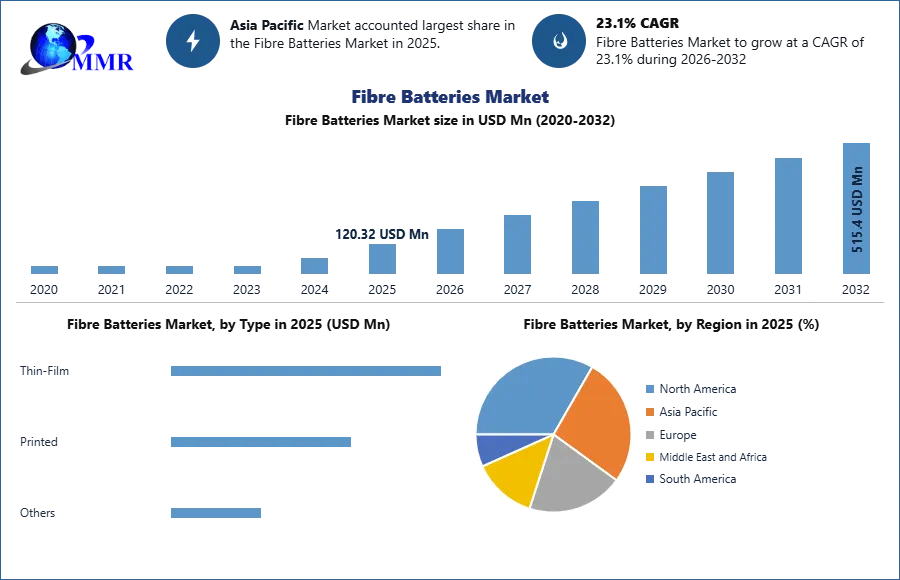 Fibre Batteries Market size was valued at USD 120.32 Mn. in 2025 and the total Fibre Batteries revenue is expected to grow by 23.1 % from 2026 to 2032, reaching nearly USD 515.4 Mn.