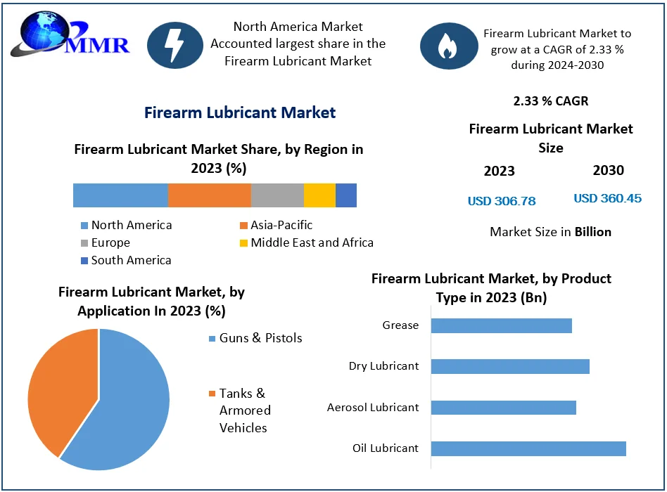 Firearm Lubricant Market Report Coverage Details Base Year: 2023 Forecast Period: 2024-2030 Historical Data: 2018 to 2023 Market Size in 2023: US $ 306.78 Mn. Forecast Period 2024 to 2030 CAGR: 2.33% Market Size in 2030: US $ 360.45 Mn. Segments Covered: by Product Type Oil Lubricant Aerosol Lubricant Dry Lubricant Grease by Application Guns & Pistols Tanks & Armored Vehicles by Region