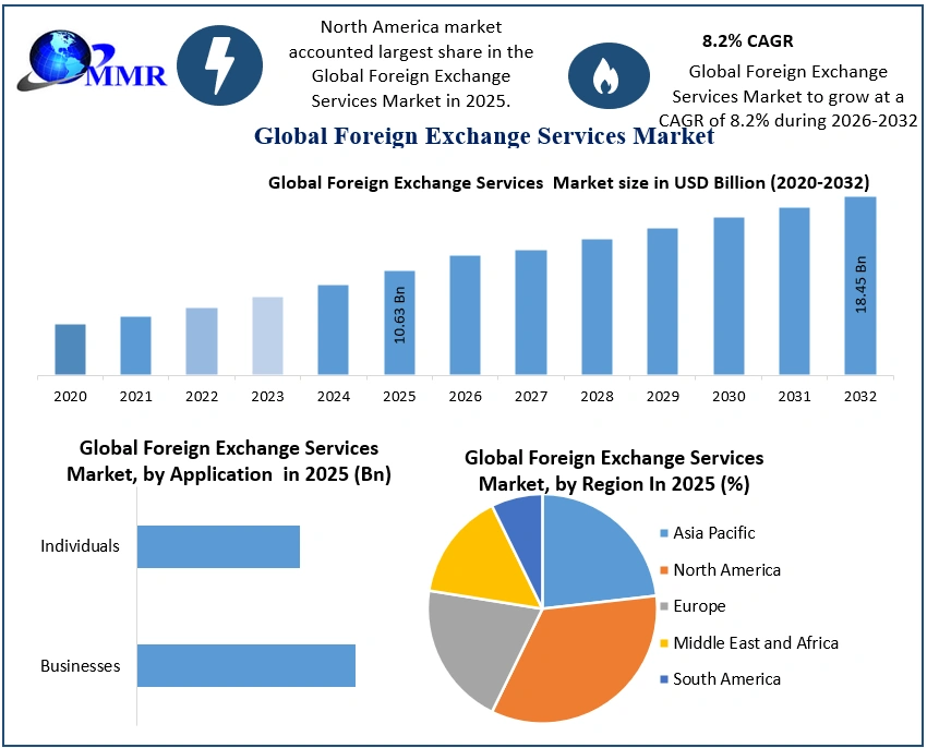 Foreign Exchange Services Market Report Coverage Details Base Year: 2025 Forecast Period: 2026-2032 Historical Data: 2020 to 2025 Market Size in 2025: USD 10.63 Bn. Forecast Period 2026 to 2032 CAGR: 8.2 % Market Size in 2032: USD 18.45 Bn. Segments Covered: By Service Currency Exchange Remittance Service Foreign Currency Accounts Other By Providers Banks Money Transfer Operators Other By Application Businesses Individuals Foreign Exchange Services Market, by Region: