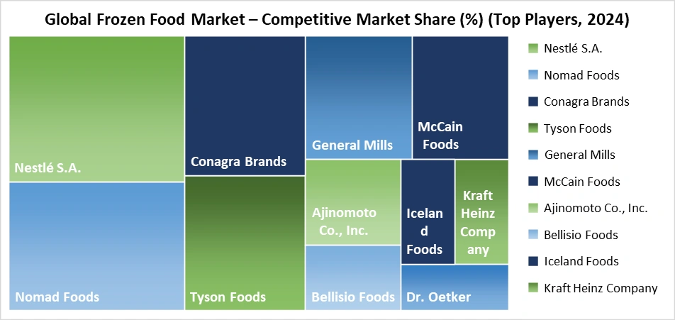 The Frozen Food Market is shaped by a clear divide between scale-driven multinationals and regionally focused specialists. Nestlé sets the benchmark, with its frozen portfolio generating over USD 12 billion globally, anchored in ready meals and strong penetration across North America and Western Europe. In Europe, Nomad Foods operates as a category consolidator, commanding leadership in frozen vegetables and fish with €3.1 billion in revenue and deep private-label style efficiency at branded scale. McCain Foods remains structurally dominant in frozen potatoes and snacks, supplying both retail and foodservice channels across more than 160 countries. In the US, Conagra Brands and General Mills compete on frozen meals and convenience formats, using aggressive pricing and brand breadth to defend shelf space. Protein-heavy players like Tyson Foods and Maple Leaf Foods leverage integrated meat supply chains to control cost and volume. Meanwhile, companies such as Dr. Oetker, Ajinomoto, Nichirei, Iceland Foods, and Schwan’s win through specialization, excelling in bakery, ethnic meals, and direct-to-consumer freezer models.![]()