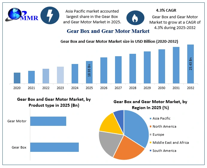 Gear Box and Gear Motor Market Report Coverage Details Base Year: 2025 Forecast Period: 2026-2032 Historical Data: 2020 to 2025 Market Size in 2025: USD 18.93 Bn. Forecast Period 2026 to 2032 CAGR: 4.3% Market Size in 2032: USD 25.43 Bn. Segments Covered: by Product type 1.Gear Box 2.Gear Motor by Gear type 1.Spur Gear 2.Helical Gear 3.Bevel Gear 4.Worm Gear 5.Planetary Gear 6.Cycloidal Gear by End-use industry 1.Automotive 2.Industrial 3.Food and Beverage 4.Others Gear Box and Gear Motor Market, by Region