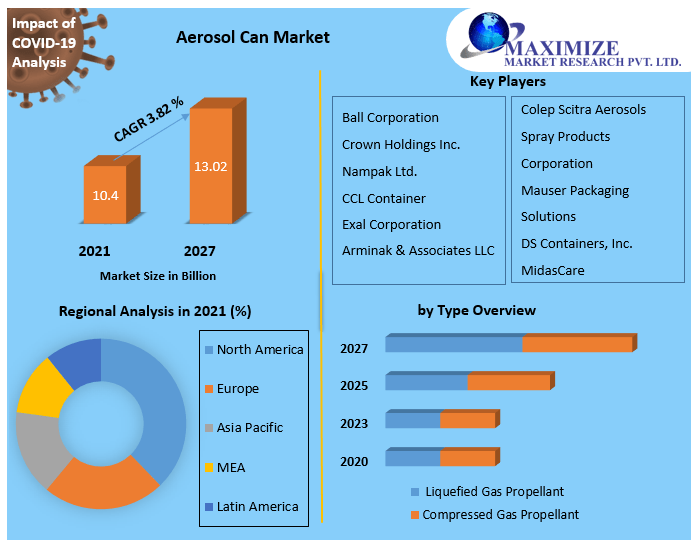 An aerosol can is a self-contained, handheld dispenser or container that sprays small mists, sprays, or foams liquid particles. It's commonly made of aluminum, steel, or plastic, and it keeps the contents safe from light, air, humidity, gases, and microorganisms. It consists of a shell, a valve, a dip tube, a liquid product, and a liquefied-gas propellant mixture. When the valve opens, the product flows up through the dip tube, and the propellant vaporizes it into fine particles. In comparison to other packaging types, aerosol cans are more convenient to use, are hermetically sealed, and contain multi-layered laminations.To know about the Research Methodology :- Request Free Sample Report