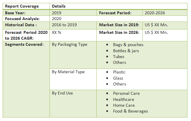Airless Packaging Market Report Coverage Details Base Year: 2021 Forecast Period: 2021-2029 Historical Data: 2017 to 2021 Market Size in 2021: US $ 5.61 Bn. Forecast Period 2021 to 2029 CAGR: 5.9% Market Size in 2029: US $ 8.87 Bn. Segments Covered: by Packaging Type • Bags & pouches • Bottles & jars • Tubes • Others by Material Type • Plastic • Glass • Others by End-User • Personal Care • Healthcare • Home Care • Food & Beverages Airless Packaging Market by Region