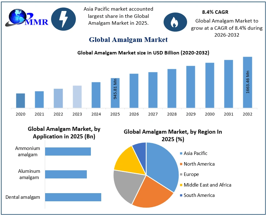 Global Amalgam Market Report Coverage Details Base Year: 2025 Forecast Period: 2026-2032 Historical Data: 2020 to 2025 Market Size in 2025: USD 5 Bn. Forecast Period 2026 to 2032 CAGR: 8.4% Market Size in 2032: USD 10 Bn. Segments Covered: by Product Copper Mercury Silver Tin Other amalgam by Application Dental amalgam Aluminum amalgam Ammonium amalgam Amalgam Market, by Region