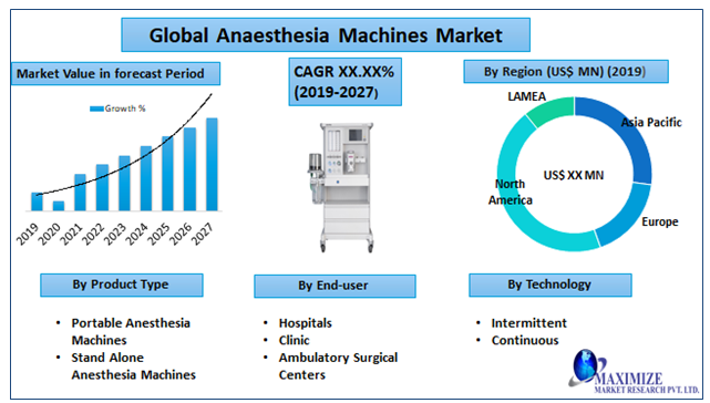 Anaesthesia Machines Market size is expected to reach US$ 19.39 Bn. by 2029, at a CAGR of 7.55% during the forecast period. An anaesthesia Machine is an essential part of the hospital-care system and is also careful one of the needed medical device in ambulatory units and nursing homes. Modern anaesthesia machines greatly upsurge patient safety. Continuous growths have been witnessed in designing of anaesthesia machines with a vision to enhance patient safety, operating efficiency, outcome and convenience. Key players are focusing on novel product development and launching of inventive products with additional features and abilities. The scope of the MMR report includes a detailed study of global and regional markets for anaesthesia machines with the reasons given for variations in the growth of the healthcare industry in certain regions.To know about the Research Methodology :- Request Free Sample Report The fact that Covid-19 is mostly a respiratory ailment has enhanced market growth. There is an increased demand for respirational devices such as nebulizers, ventilators, pulse, spirometers oximeters then oxygen therapy is a major interference for patients with severe Covid-19 infection, and this factor is contributing to the anaesthesia machines market growth. To compensate for the lack of ventilators because of the huge demand and short supply, hospitals have ongoing tendency to convert anesthesia devices into breathing machines. The MMR report will provide an accurate prediction of the contribution of the various segments to the growth of the anaesthesia machines market size. By technology, continuous technology segment was valued US$ xx Mn. in 2021 and is expected to reach a value of US$ xx Mn. by 2029, with a CAGR of xx.22% during the forecast period. The continuous improvements in the healthcare industry and the adoption of minimal disturbing surgeries are favoring the growth of the global market for anesthesia machines. Region-wise, North America Anaesthesia Machines Market was valued US$ xx Mn. in 2021 and is expected to reach a value of US$ xx Mn. by 2029, with a CAGR of xx.56% during 2022-2029. This is attributed to the high adoption rate of advanced hospital care systems with anesthesia machines. For now, the market is also likely to witness considerable growth in the APAC region. Growing healthcare awareness and growing disposable income in developing economies like India and China will be supporting the growth of the Asia anaesthesia machines market. In recent years, major players in the anaesthesia machines market have taken several strategic measures, like facility expansions and partnerships. Such as, in 2021, Smiths Medical Company launched their three novel anesthesia products CADD Infusion Systems, Echo-Glow Peripheral Nerve Block, and wireless-enabled CADD Solis Infusion Pump at American Society of Local Anesthesia & Pain Management Drug. The main aim of this launch was to expand its portfolio and expand its business. The objective of the report is to present a comprehensive analysis of the Global Anaesthesia Machines Market including all the stakeholders of the industry. The past and current status of the industry with forecasted market size and trends are presented in the report with the analysis of complicated data in simple language. The report covers all the aspects of the industry with a dedicated study of key players that includes market leaders, followers and new entrants. PORTER, SVOR, PESTEL analysis with the potential impact of micro-economic factors of the market has been presented in the report. External as well as internal factors that are supposed to affect the business positively or negatively have been analyzed, which will give a clear futuristic view of the industry to the decision-makers. The report also helps in understanding Global Anaesthesia Machines Market dynamics, structure by analyzing the market segments and projects the Global Anaesthesia Machines Market size. Clear representation of competitive analysis of key players by Application, price, financial position, Product portfolio, growth strategies, and regional presence in the Global Anaesthesia Machines Market make the report investor’s guide.