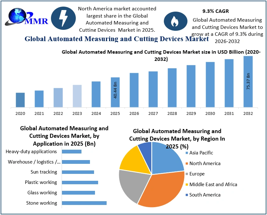 Global Automated Measuring and Cutting Devices Market Report Coverage Details Base Year: 2025 Forecast Period: 2026-2032 Historical Data: 2020 to 2025 Market Size in 2025: USD 40.44 Bn. Forecast Period 2026 to 2032 CAGR: 9.3% Market Size in 2032: USD 75.37 Bn. Segments Covered: by Application Stone working Glass working Plastic working Sun tracking Warehouse / logistics / handling / conveyor technology Heavy-duty applications by Industry Automotive & Transportation Aerospace & Defense IT & Telecommunications Education & Government Semiconductor & Electronics Industrial Healthcare (Medical) Textile Construction Packaging Wood Processing Chemical/Pharmaceutical Global Automated Measuring and Cutting Devices Market, by Region