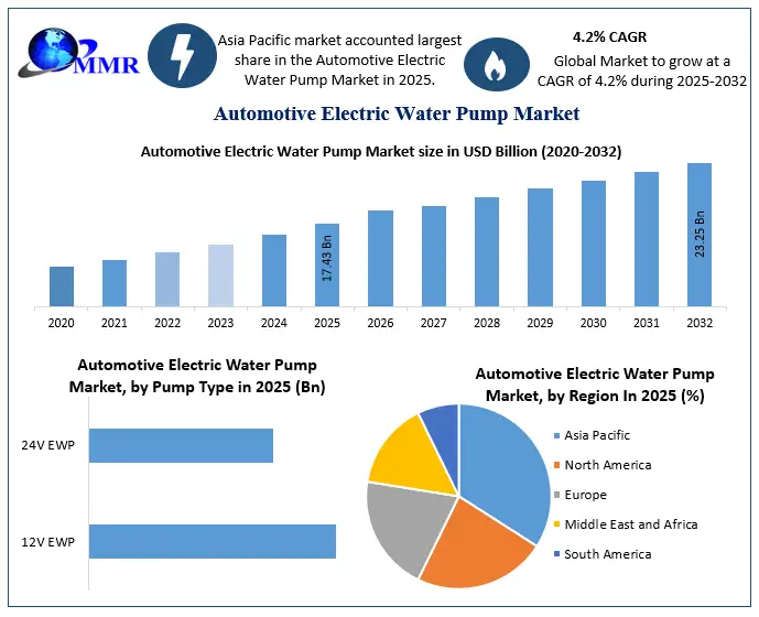 Automotive Electric Water Pump Market Report Coverage Details Base Year: 2025 Forecast Period: 2026-2032 Historical Data: 2020 to 2025 Market Size in 2025: US $ 17.43 Bn. Forecast Period 2026 to 2032 CAGR: 4.2% Market Size in 2032: US $ 23.25 Bn. Segments Covered: by Pump Type 12V EWP 24V EWP by Vehicle Type Light Commercial Vehicle Heavy Commercial Vehicle Passenger Vehicle by Sale Channel OEMs Aftermarket by Region
