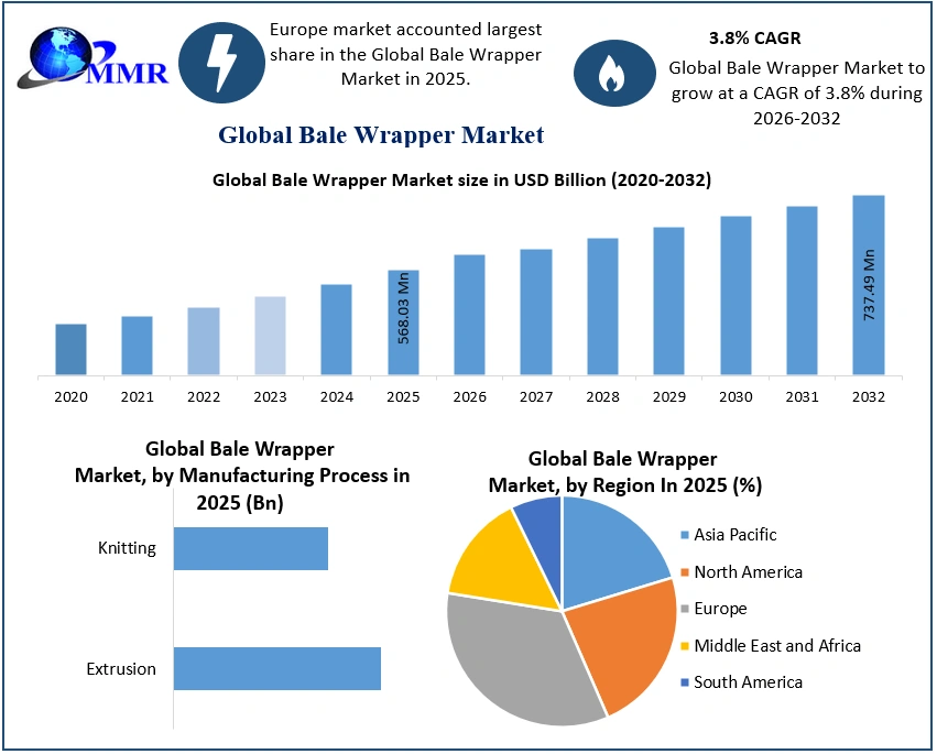 Global Bale Wrapper Market Report Coverage Details Base Year: 2025 Forecast Period: 2026-2032 Historical Data: 2020 to 2025 Market Size in 2025: USD 568.03 Mn. Forecast Period 2026 to 2032 CAGR: 3.8% Market Size in 2032: USD 737.49 Mn. Segments Covered: by Manufacturing Process Extrusion Knitting by Product Type Twine Wrapping Others Global Bale Wrapper Market, by Region