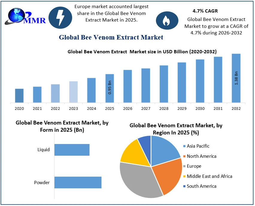 Global Bee Venom Extract Market Report Coverage Details Base Year: 2025 Forecast Period: 2026-2032 Historical Data: 2020 to 2025 Market Size in 2025: USD 0.95 Bn. Forecast Period 2026 to 2032 CAGR: 5.4% Market Size in 2032: USD 1.38 Bn. Segments Covered: by Form Powder Liquid by Application Pharmaceutical Cosmetic & Personal care Global Bee Venom Extract Market, by Region