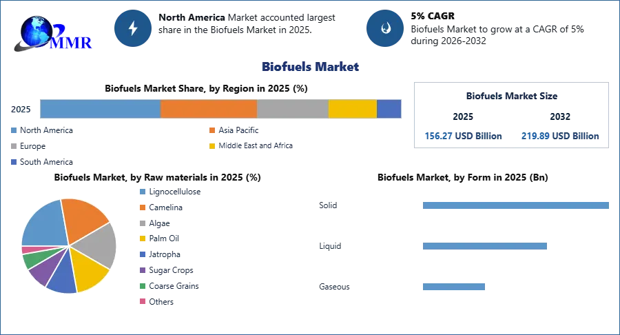 The Biofuels Market size was valued at USD 156.27 Billion in 2025 and the total Biofuels revenue is expected to grow at a CAGR of 5% from 2026 to 2032, reaching nearly USD 219.89 Billion.