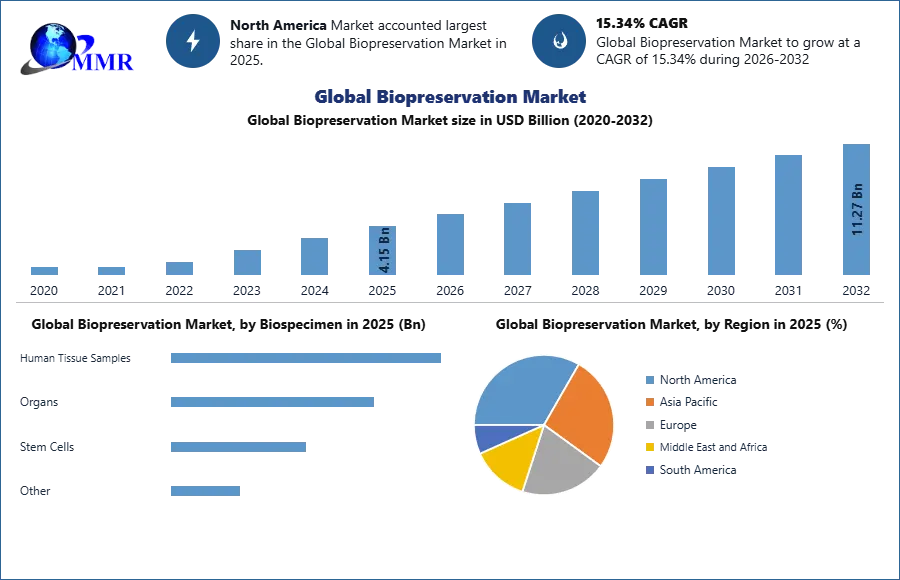 Global Biopreservation Market size was valued at US$ 4.15 Bn. in 2025 and the total revenue is expected to grow at 15.34% through 2026 to 2032, reaching nearly US$ 11.27 Bn by 2032.