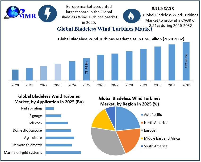 Global Bladeless Wind Turbines Market Report Coverage Details Base Year: 2025 Forecast Period: 2026-2032 Historical Data: 2020 to 2025 Market Size in 2025: USD 78.74 Bn. Forecast Period 2026 to 2032 CAGR: 8.51% Market Size in 2032: USD 139.48 Bn. Segments Covered: by Application Marine off-grid systems Remote telemetry Agriculture Domestic purpose Telecom Signage Rail signaling Bladeless Wind Turbines Marke, by Region